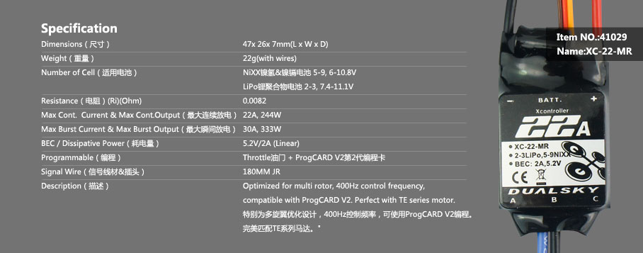Item No:| 41029 | XC-22-MR, 22 amps continuous, 2-3S Lipo, linear BEC |