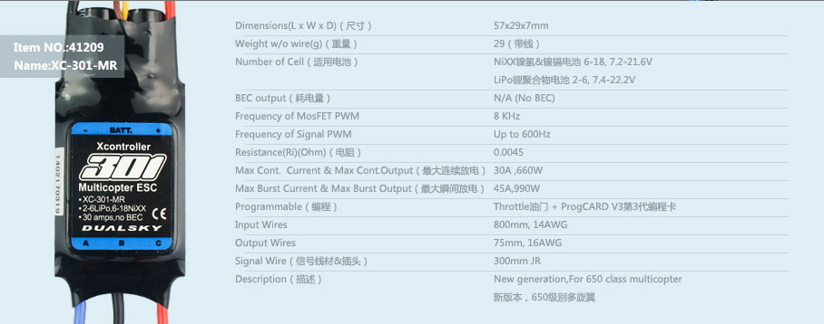 XC-301-MR, ALL NEW Designed for Mutli-copter, 30 amps continuous, 2-6S Lipo, no BEC |