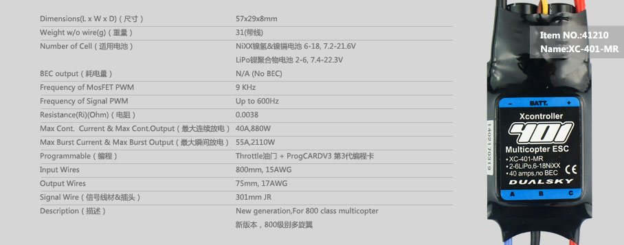 XC-401-MR, ALL NEW Designed for high end Muti-copter, 40 amps continuous, 2-6S Lipo, no BEC |