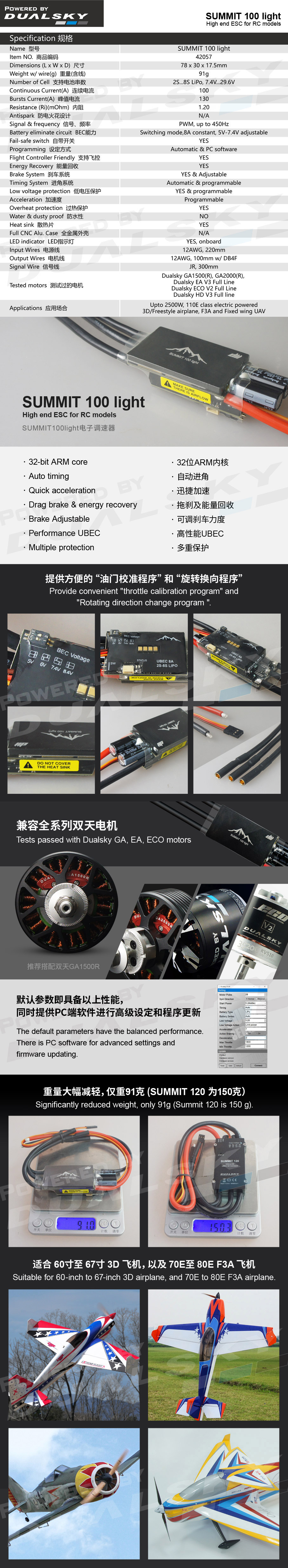 SUMMIT 100 light - 100 amps, 8S Lipo, Max 8A UBEC - All new core, 32-bit ARM, supports upto 300,000 ERPM - Smart system, auto timing, active brake - Light weight for gliders and aerobatics |