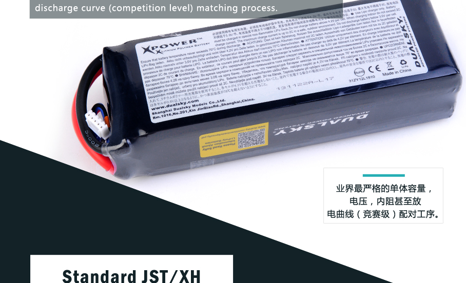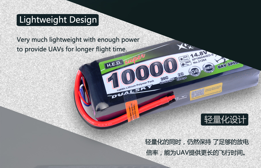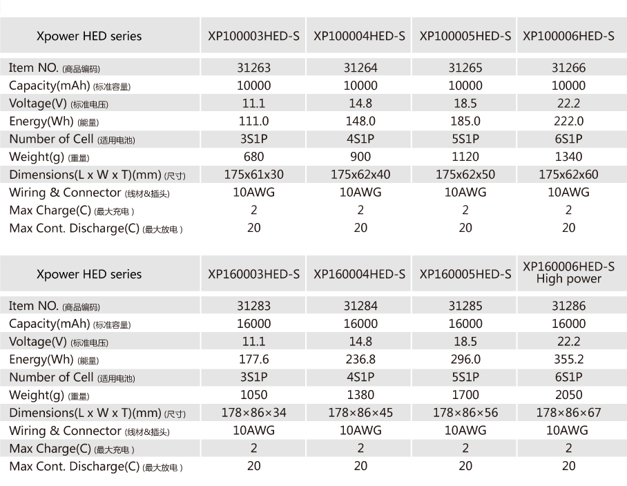 | 31286 | XP160006HED-S, , high power | 16000 | 22.2 | 355.2 | 6S1P | 2050g | 178×86×67 | 10AWG | 2C | 20C |