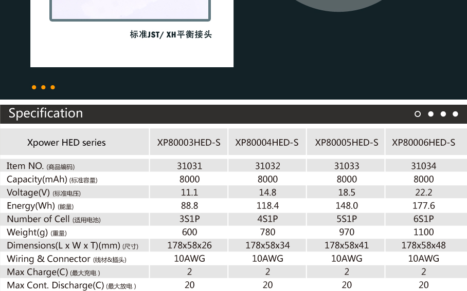 | 31034 | XP80006HED-S | 8000 | 22.2 | 177.6 | 6S1P | 1100 | 178x58x48 | 10AWG | 2C | 20C |