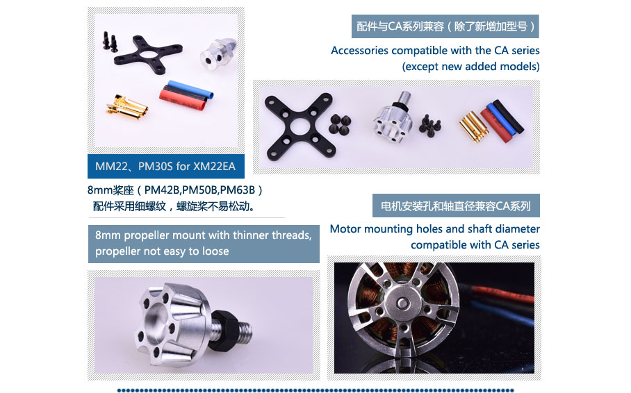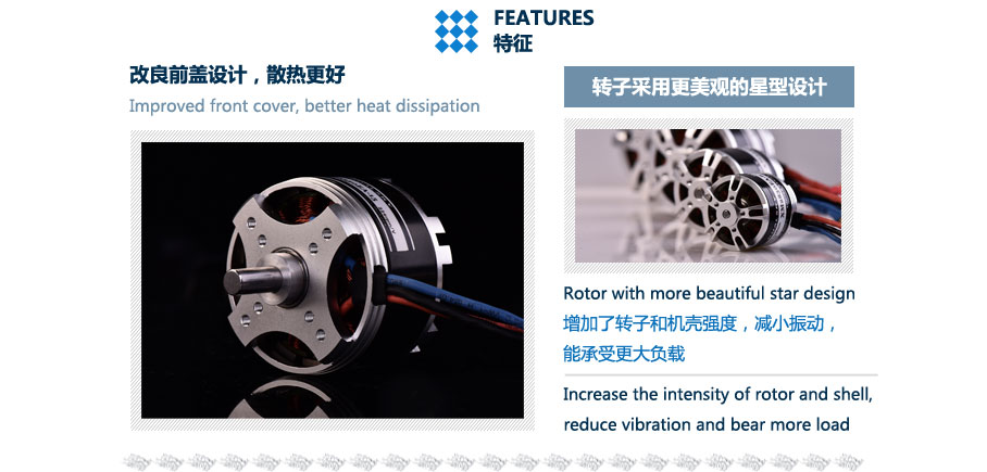 Improved front cover, better heat dissipation Rotor with more beautiful star design Use high efficiency silicon steel Partial motors upgrade Durotate technique