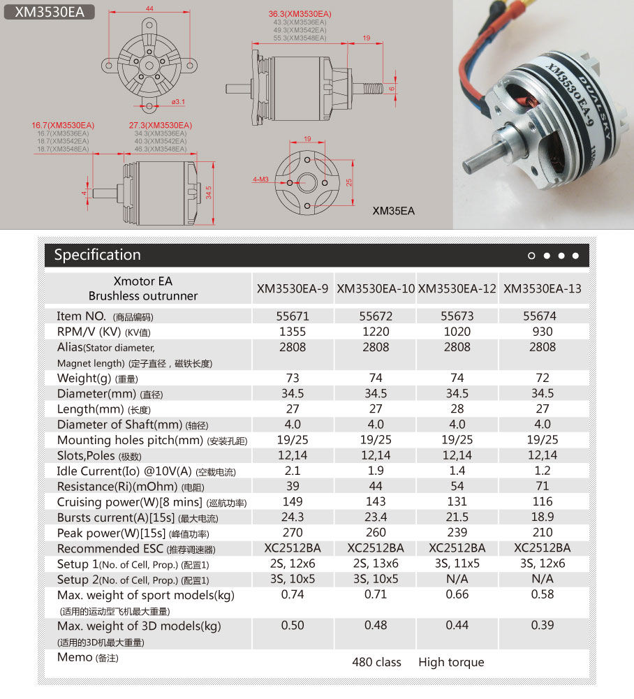 55674 XM3530EA-13 930 RPM/V 72g 210W