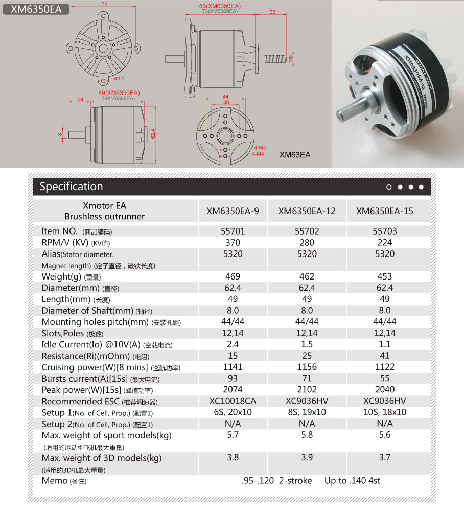 55701 XM6350EA-9 370 RPM/V 469g 2074W