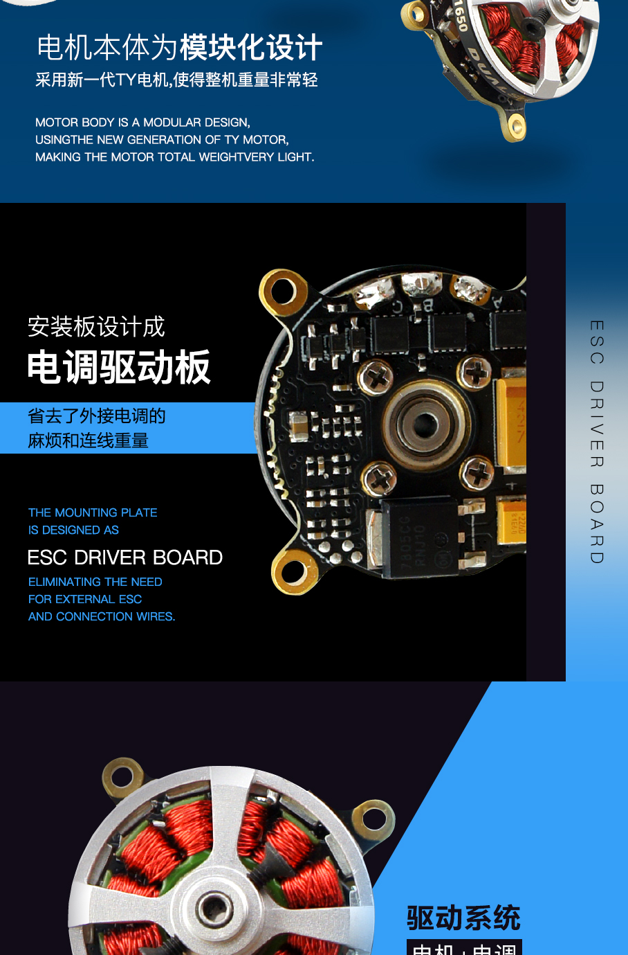 2. The mounting plate is designed as ESC driver board, eliminating the need for external ESC and connection wires.