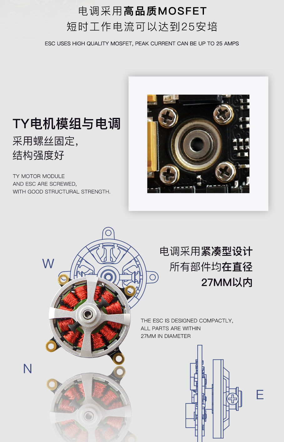 6. The ESC is designed compactly, all parts are within 27mm in diameter